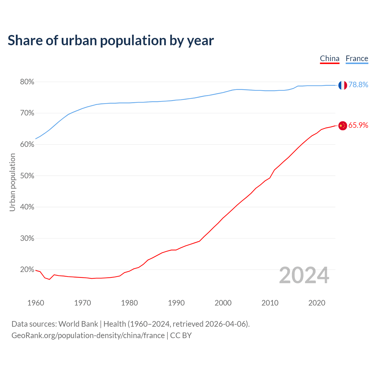 From 2004 to 2024, the share of urban population changed from 41.8% to 65.9% in China and from 77.5% to 78.8% in France.
