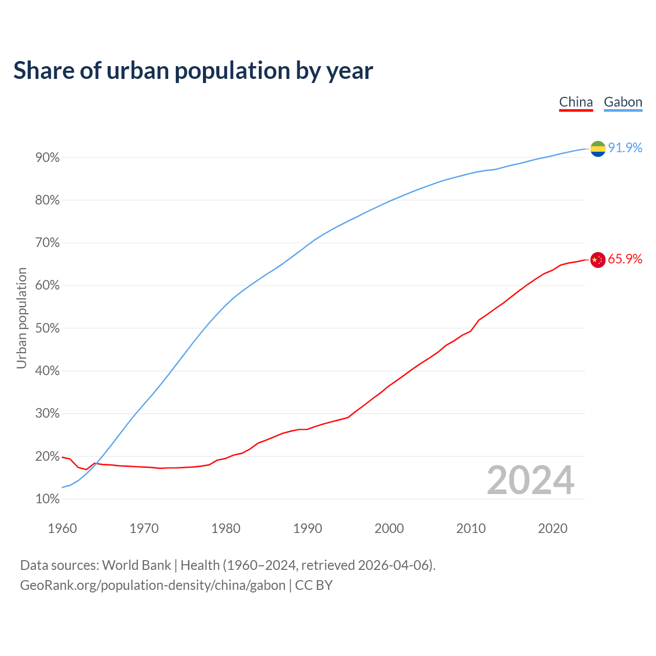 From 2004 to 2024, the share of urban population changed from 41.8% to 65.9% in China and from 82.7% to 91.9% in Gabon.