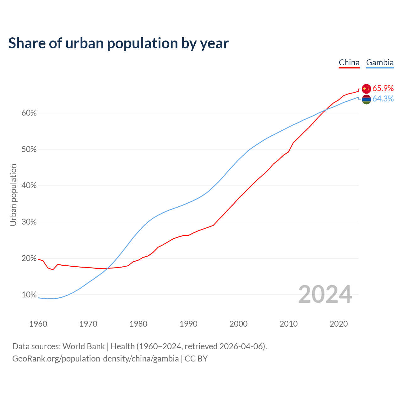 From 2004 to 2024, the share of urban population changed from 41.8% to 65.9% in China and from 51.5% to 64.3% in the Gambia.