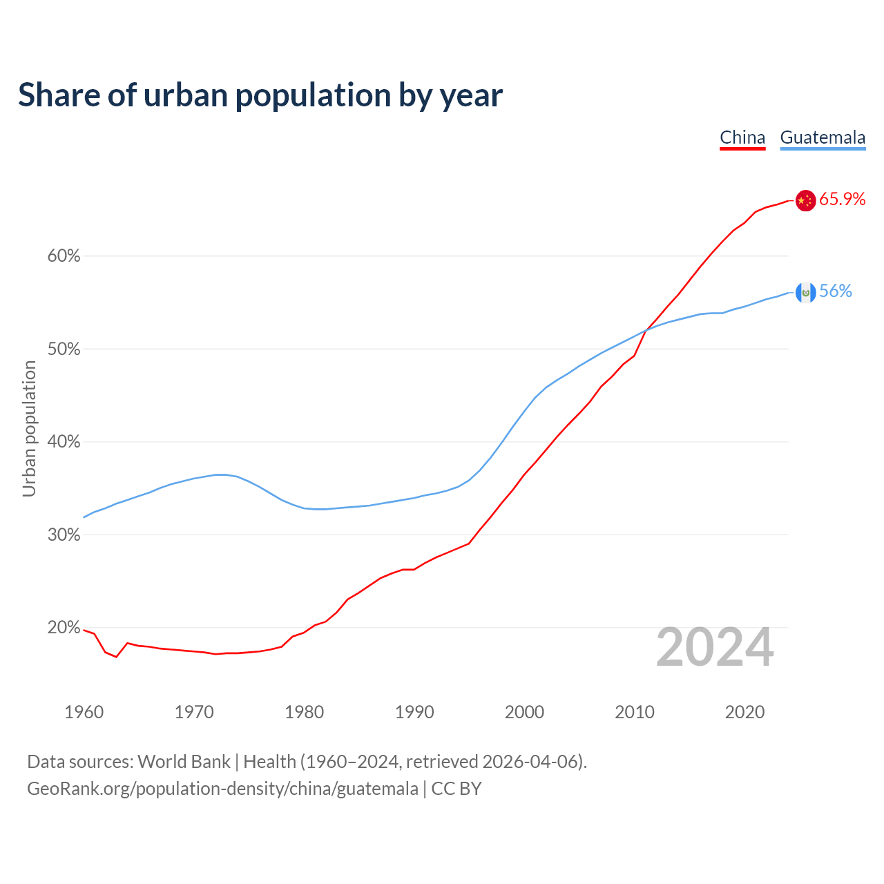 From 2004 to 2024, the share of urban population changed from 41.8% to 65.9% in China and from 47.3% to 56% in Guatemala.