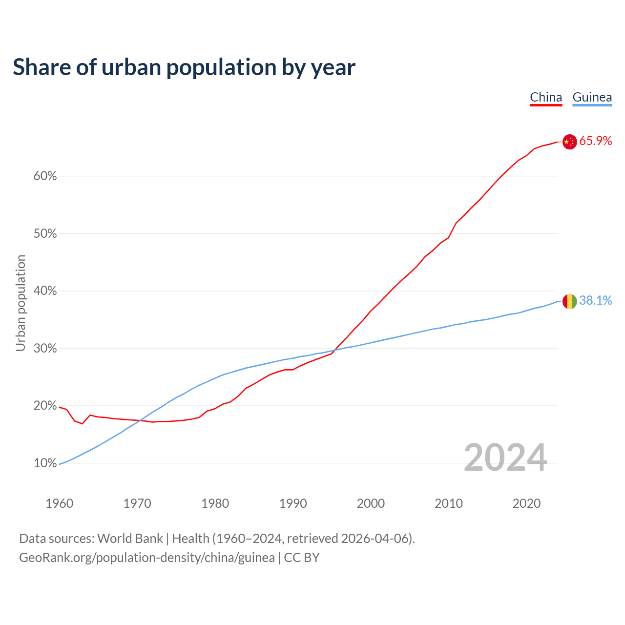 From 2004 to 2024, the share of urban population changed from 41.8% to 65.9% in China and from 32.1% to 38.1% in Guinea.