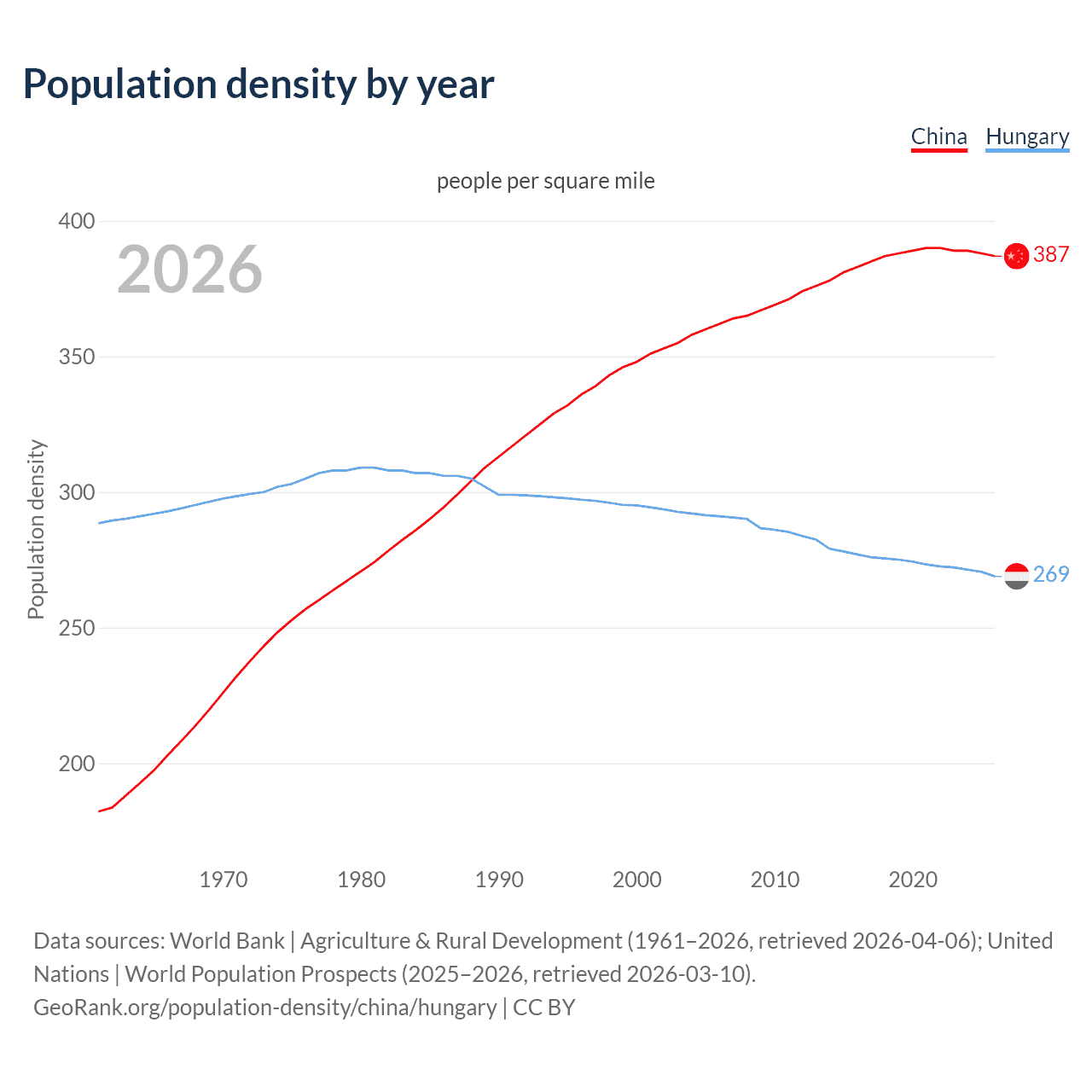 From 2006 to 2026, population density in China increased by 6.98%, compared to a 7.62% decline in Hungary.