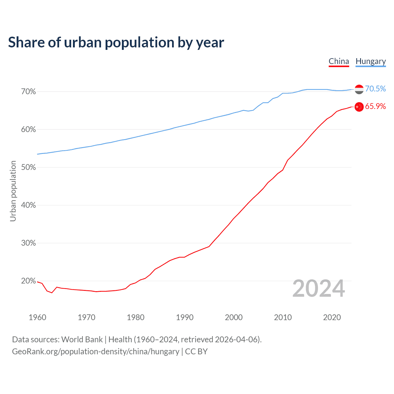From 2004 to 2024, the share of urban population changed from 41.8% to 65.9% in China and from 65% to 70.5% in Hungary.