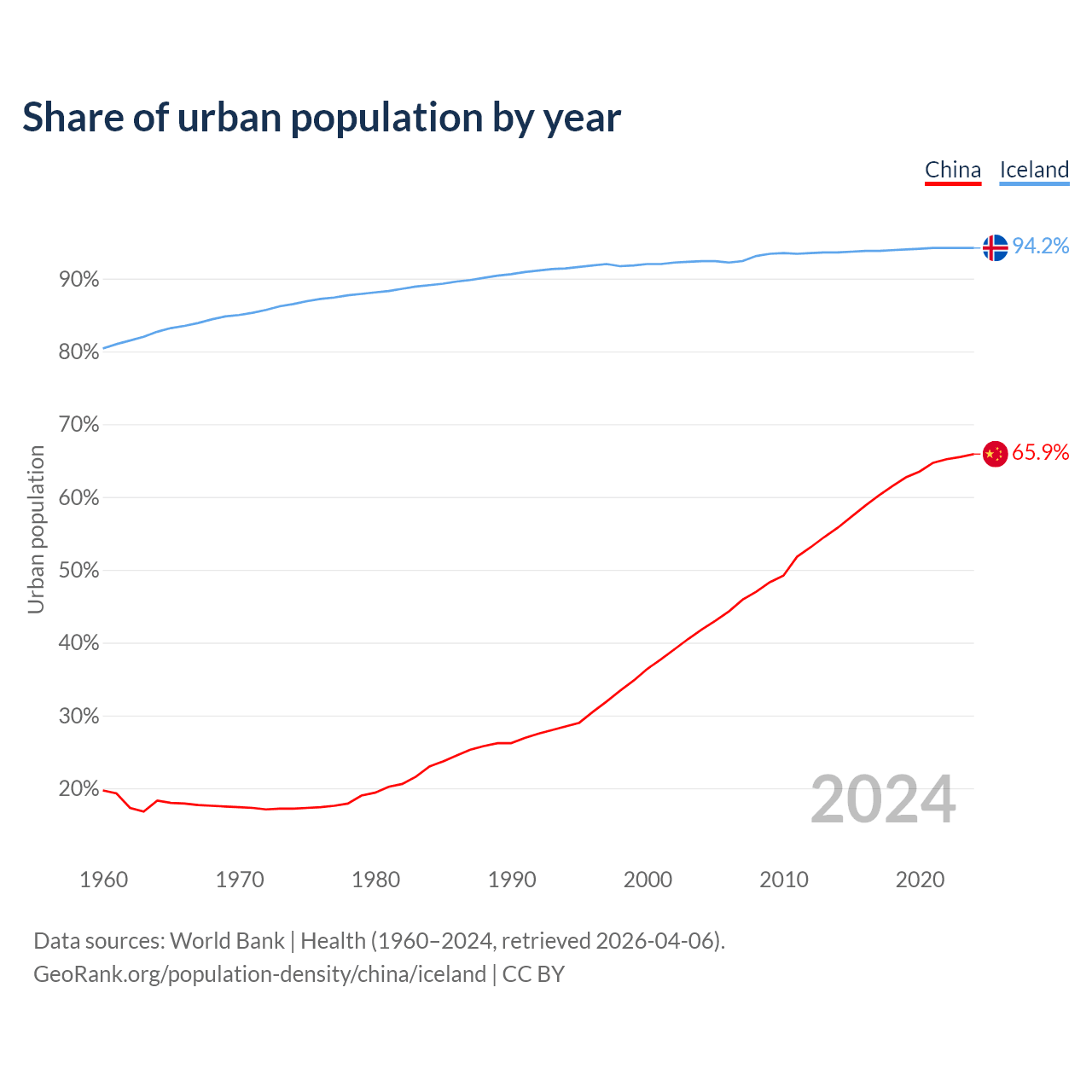 From 2004 to 2024, the share of urban population changed from 41.8% to 65.9% in China and from 92.4% to 94.2% in Iceland.