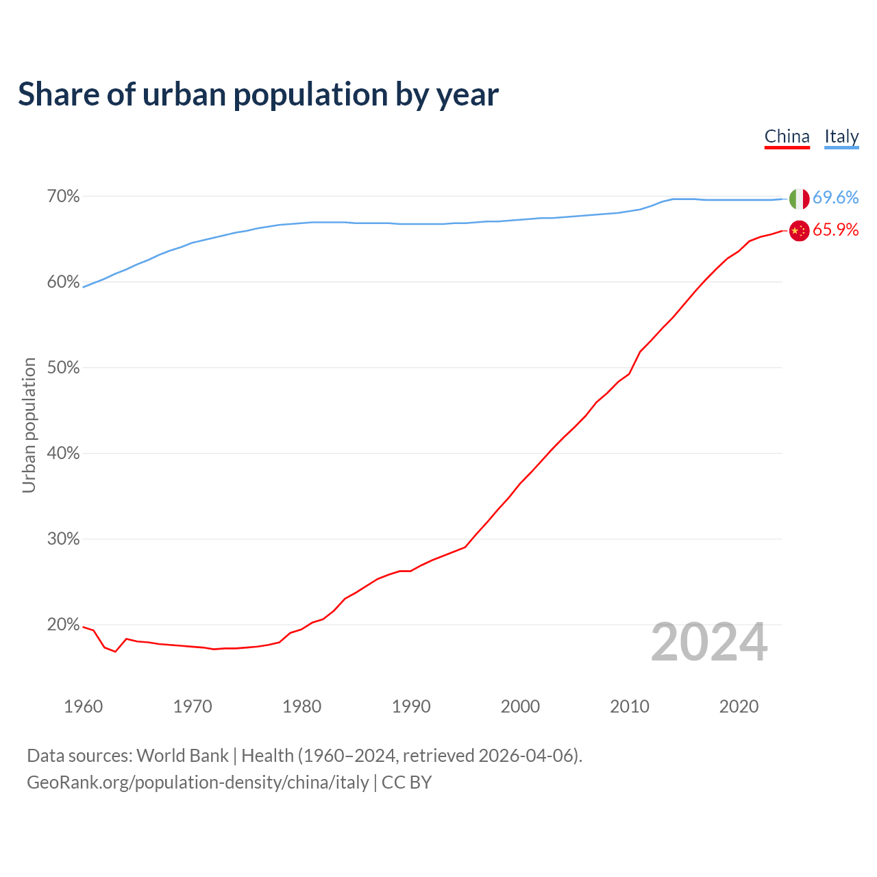 From 2004 to 2024, the share of urban population changed from 41.8% to 65.9% in China and from 67.5% to 69.6% in Italy.