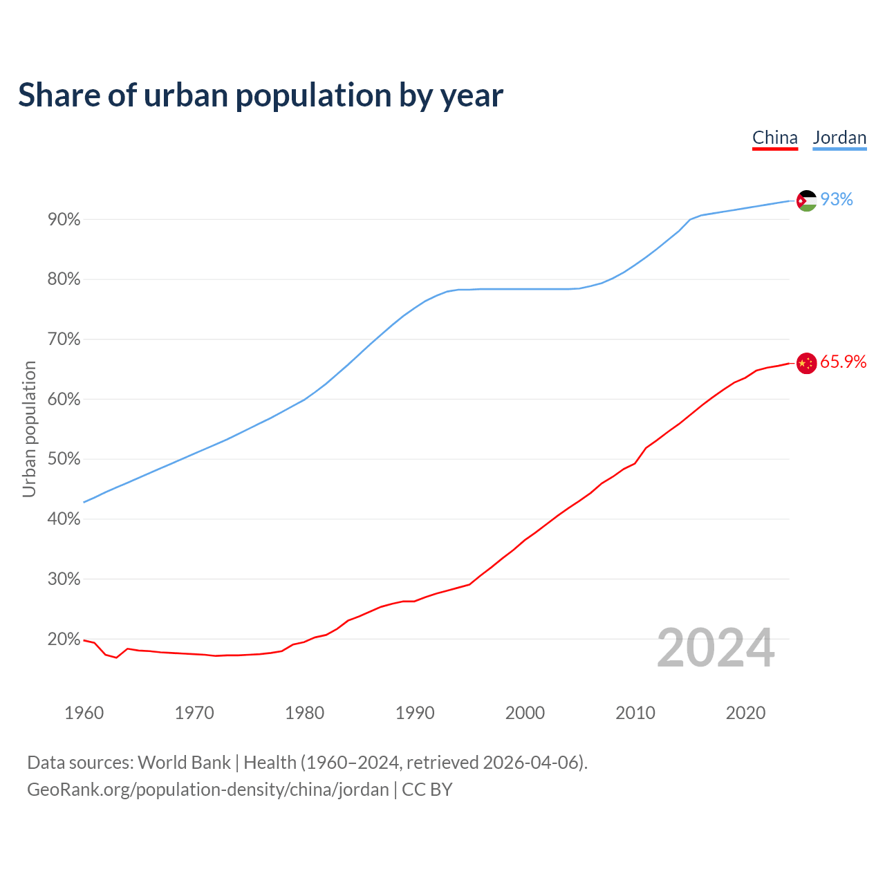 From 2004 to 2024, the share of urban population changed from 41.8% to 65.9% in China and from 78.3% to 93% in Jordan.