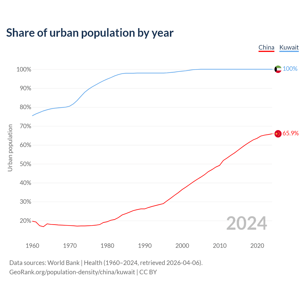 From 2004 to 2024, the share of urban population changed from 41.8% to 65.9% in China and from 99.9% to 100% in Kuwait.