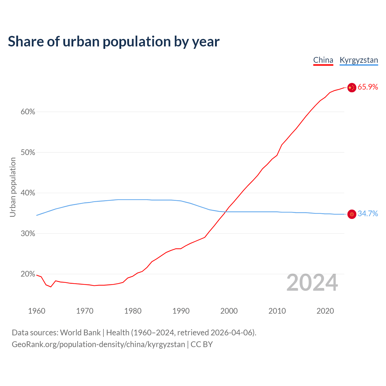 From 2004 to 2024, the share of urban population changed from 41.8% to 65.9% in China and from 35.3% to 34.7% in Kyrgyzstan.