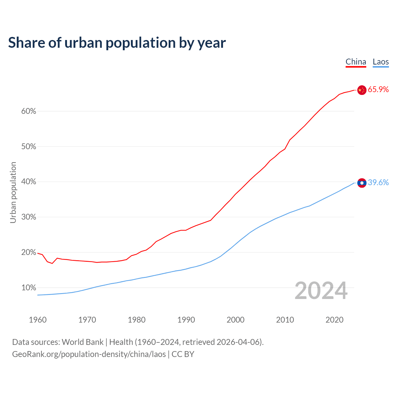 From 2004 to 2024, the share of urban population changed from 41.8% to 65.9% in China and from 26.5% to 39.6% in Laos.