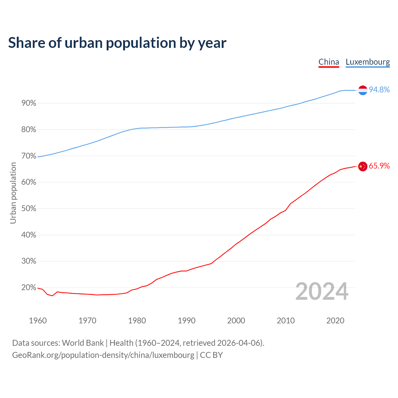 From 2004 to 2024, the share of urban population changed from 41.8% to 65.9% in China and from 86% to 94.8% in Luxembourg.