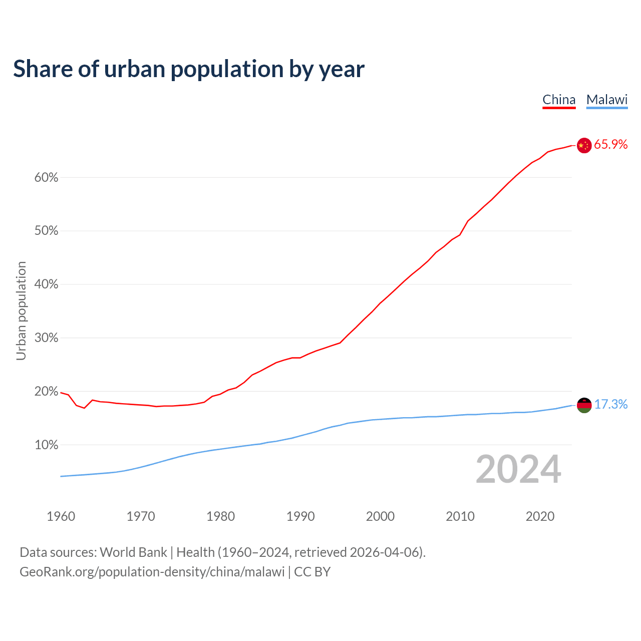 From 2004 to 2024, the share of urban population changed from 41.8% to 65.9% in China and from 15% to 17.3% in Malawi.