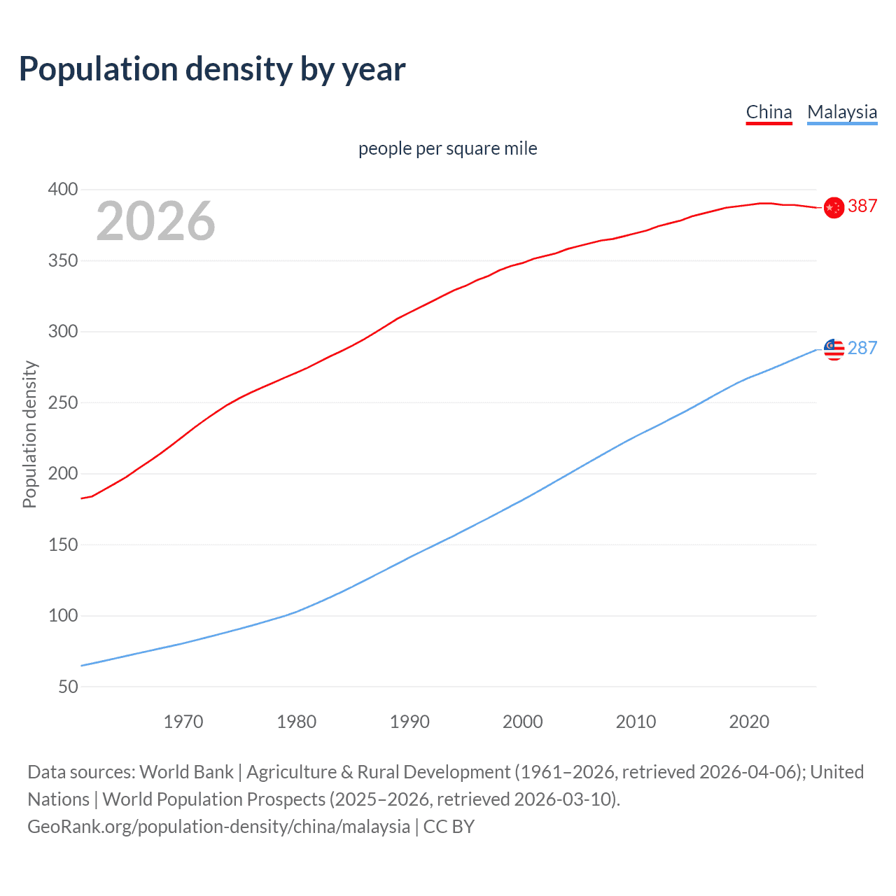 China has a population density of 387 people per square mile compared to 287 people in Malaysia. China has 73,316 sq ft of land per person vs 100,140 sq ft in Malaysia. China and Malaysia rank 67th and 85th by population density, respectively.