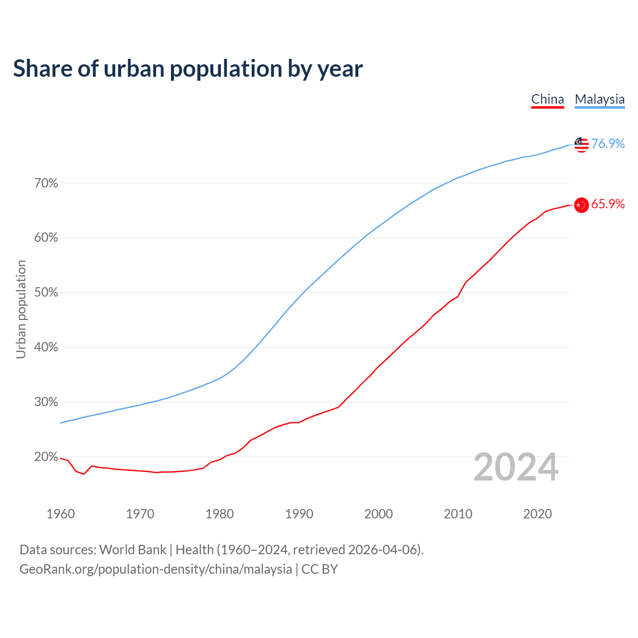 From 2004 to 2024, the share of urban population changed from 41.8% to 65.9% in China and from 66.1% to 76.9% in Malaysia.