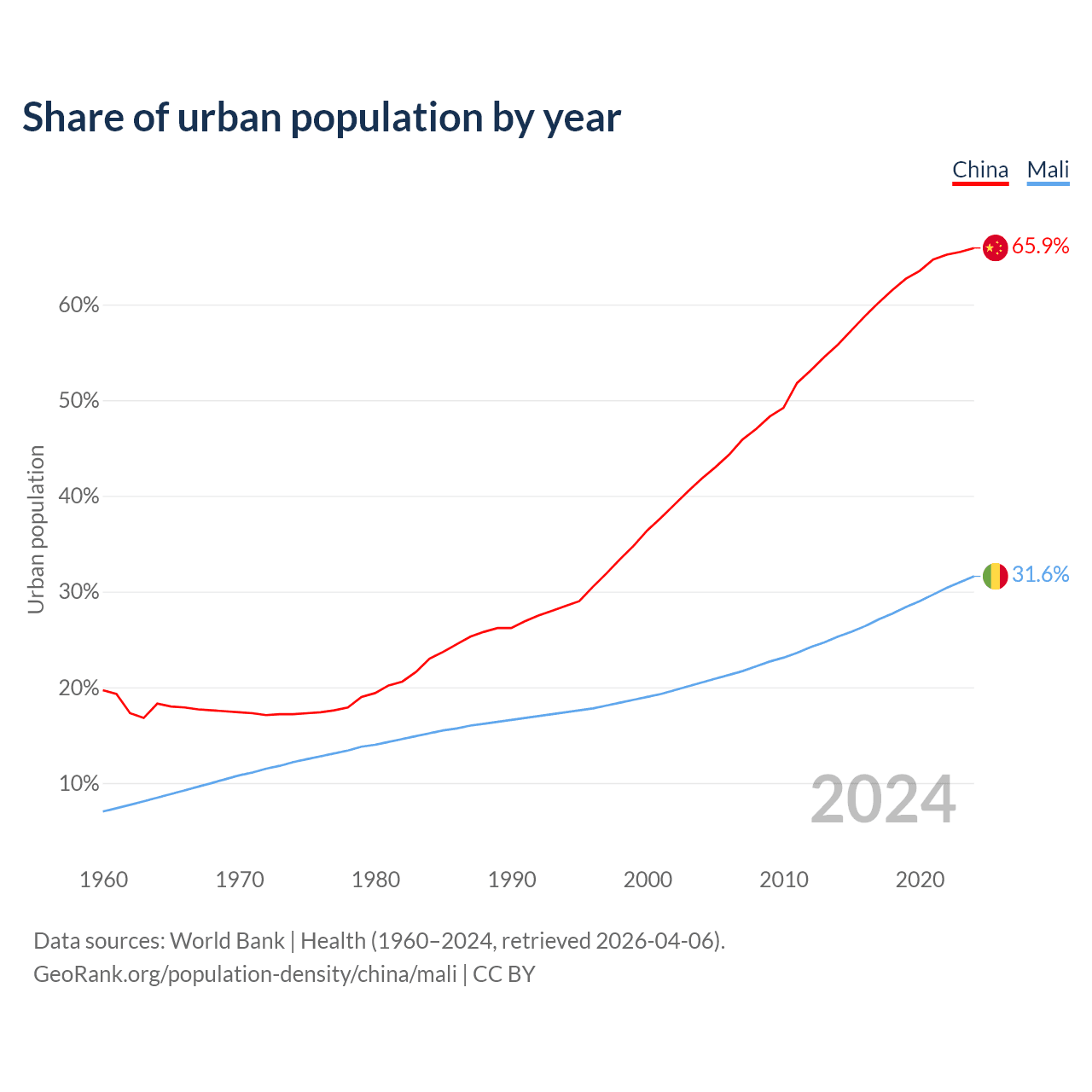 From 2004 to 2024, the share of urban population changed from 41.8% to 65.9% in China and from 20.5% to 31.6% in Mali.