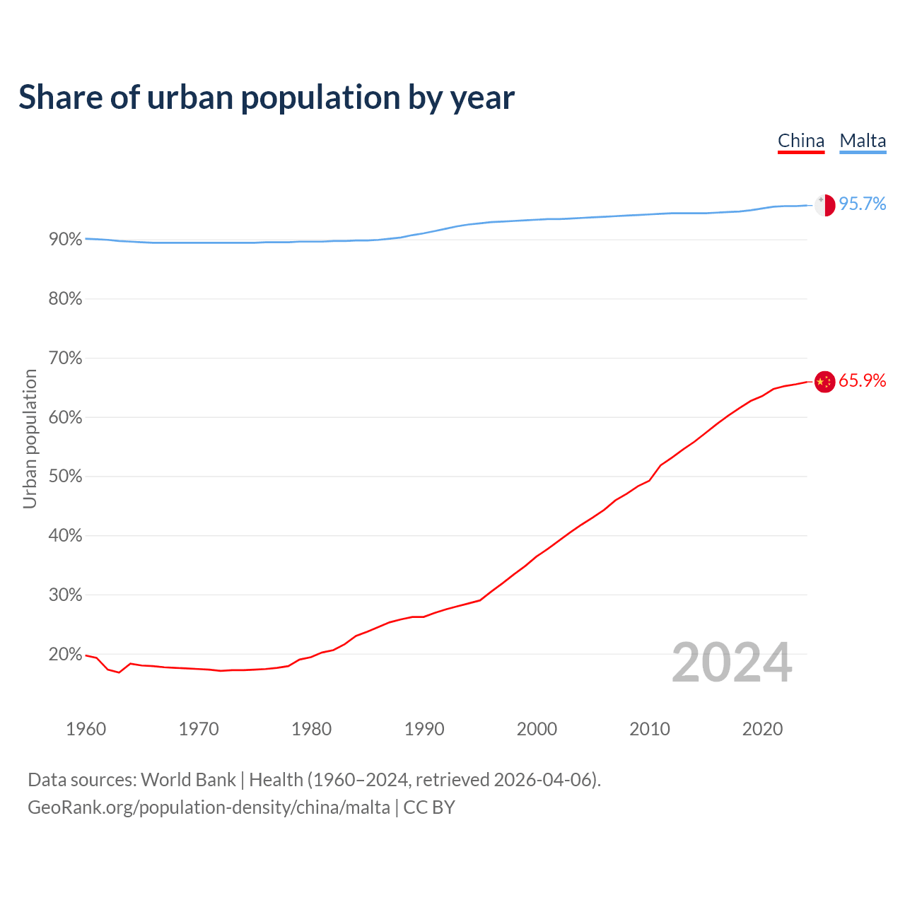 From 2004 to 2024, the share of urban population changed from 41.8% to 65.9% in China and from 93.6% to 95.7% in Malta.