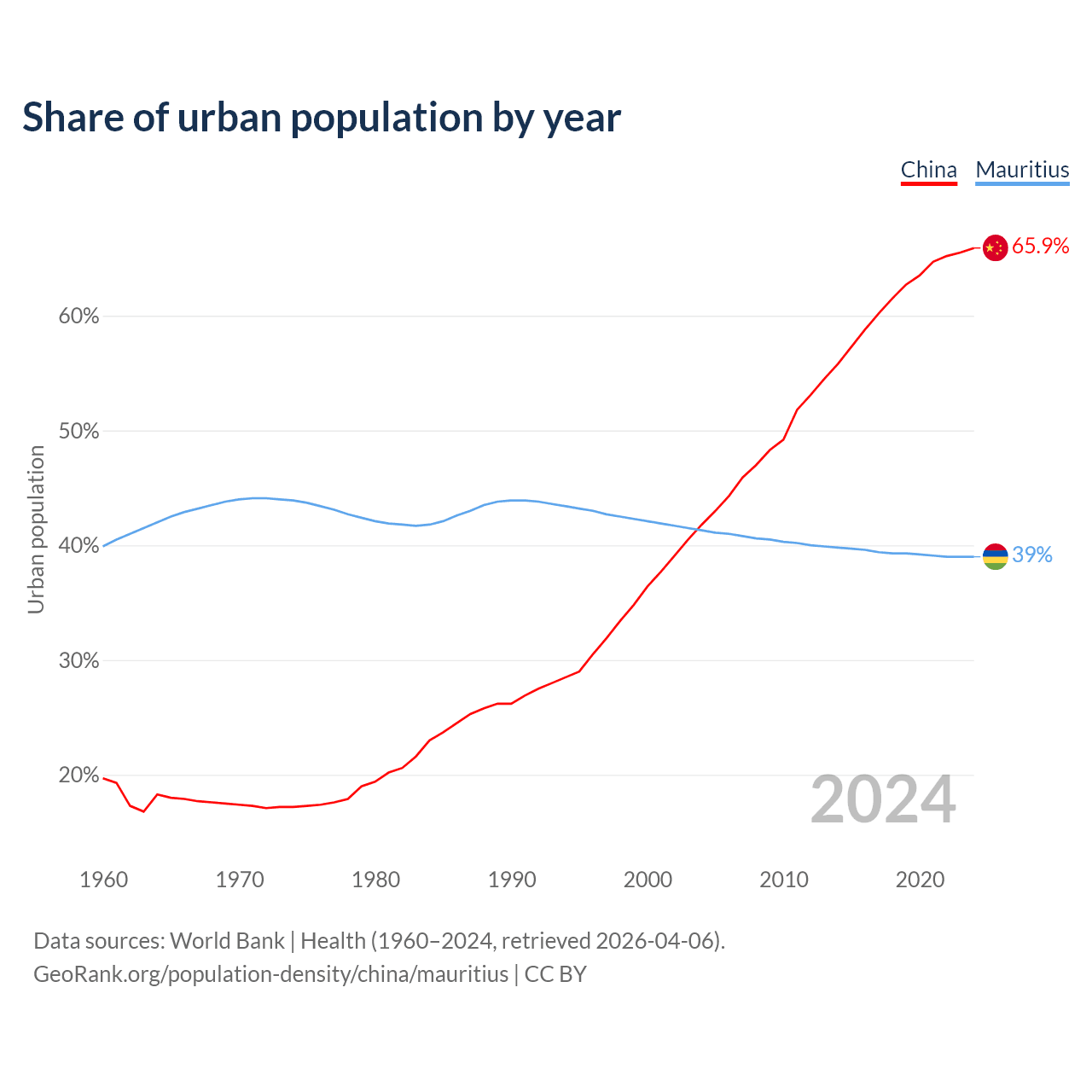 From 2004 to 2024, the share of urban population changed from 41.8% to 65.9% in China and from 41.3% to 39% in Mauritius.