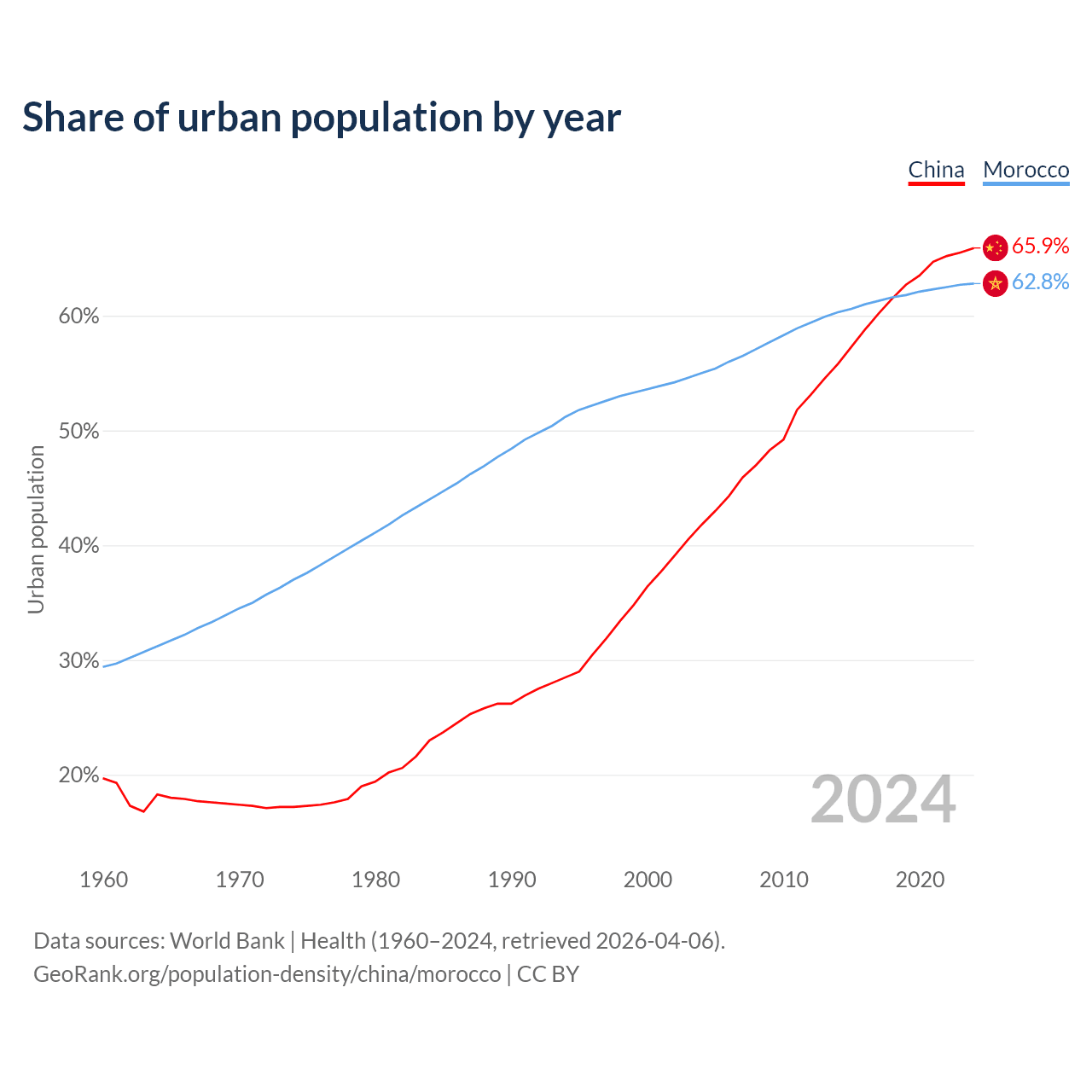 From 2004 to 2024, the share of urban population changed from 41.8% to 65.9% in China and from 55% to 62.8% in Morocco.