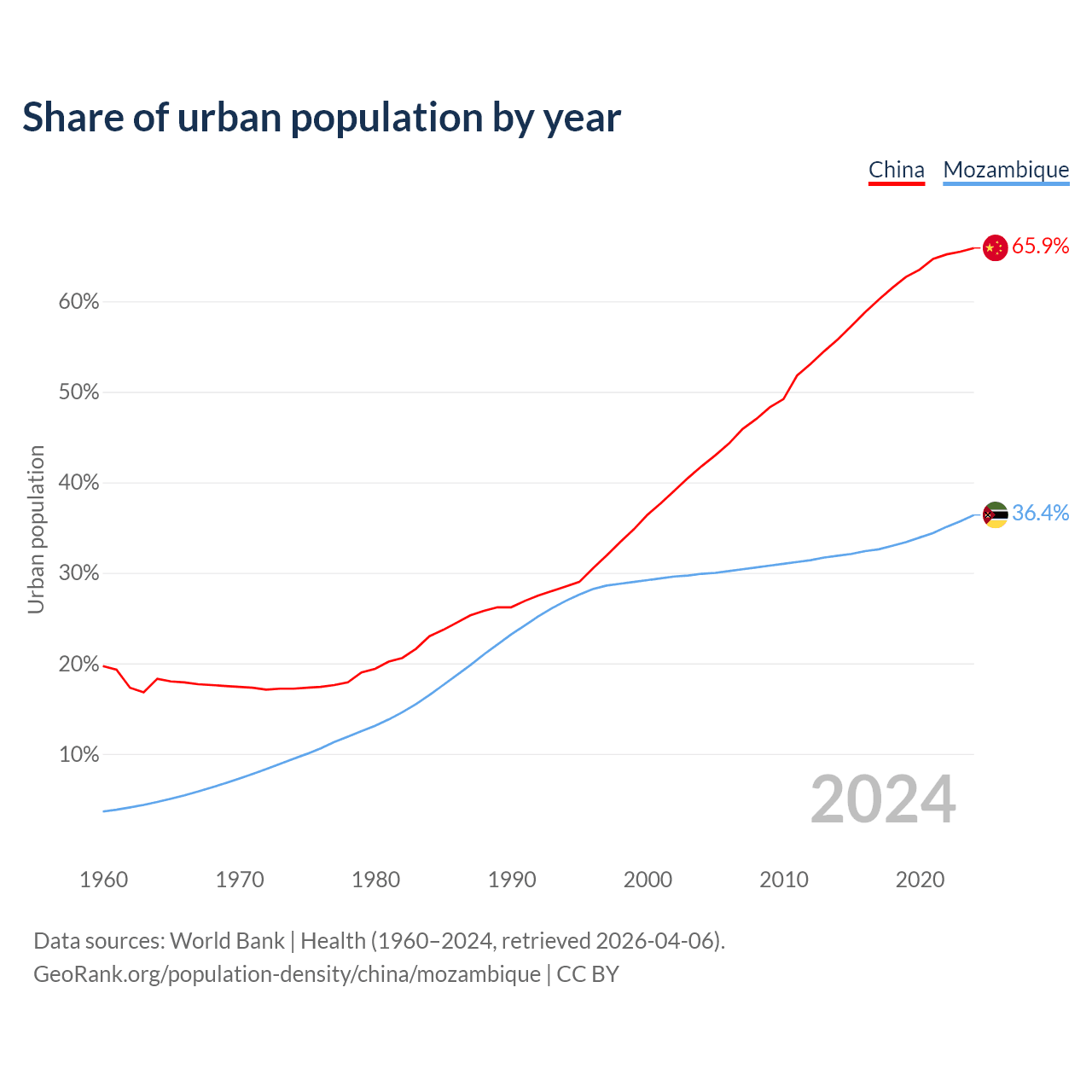 From 2006 to 2026, population density in China increased by 6.98%, compared to a 76.4% growth in Mozambique.