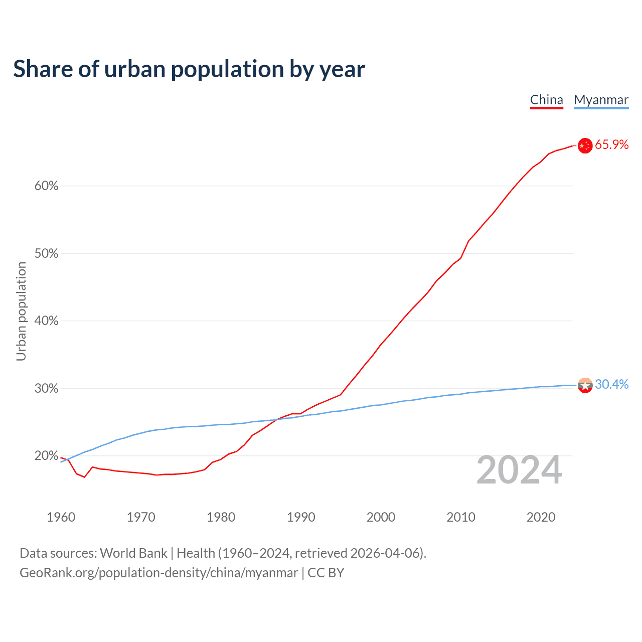 From 2006 to 2026, population density in China increased by 6.98%, compared to a 15.7% growth in Myanmar.