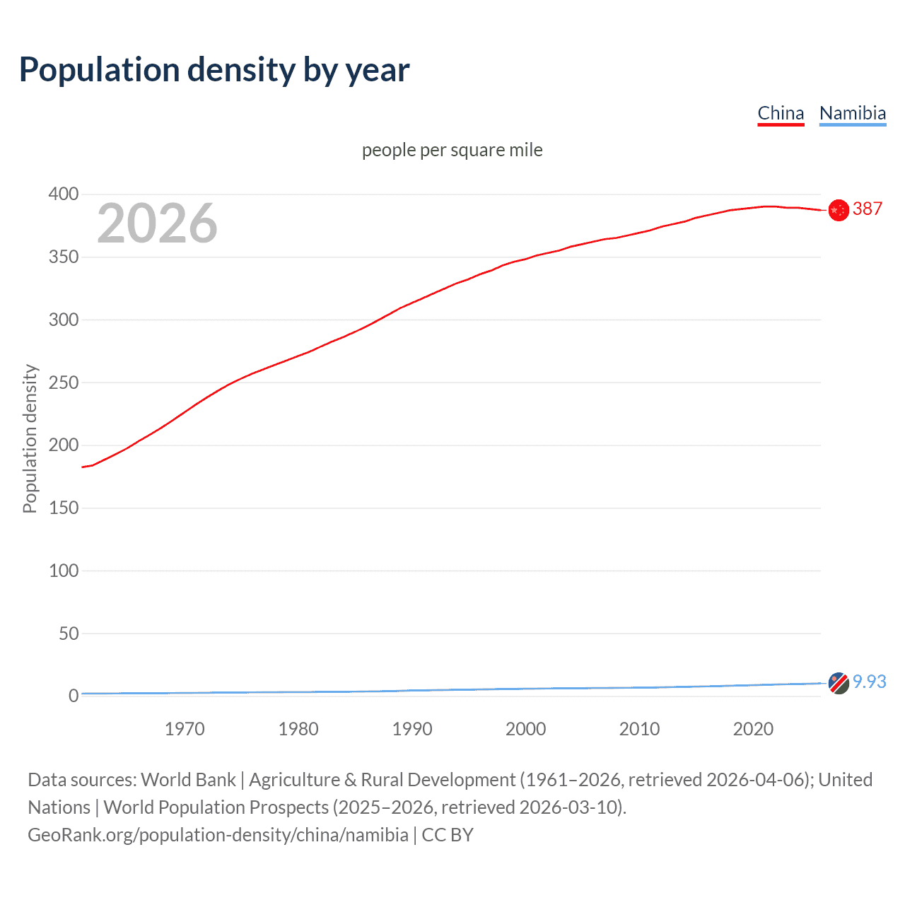 China has a population density of 387 people per square mile compared to 9.93 people in Namibia. China has 73,316 sq ft of land per person vs 2,932,826 sq ft in Namibia. China and Namibia rank 67th and 195th by population density, respectively.