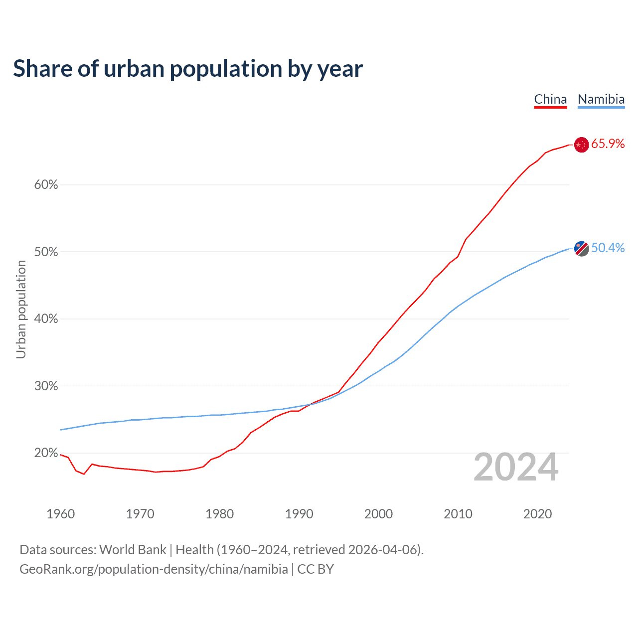 From 2004 to 2024, the share of urban population changed from 41.8% to 65.9% in China and from 35.5% to 50.4% in Namibia.