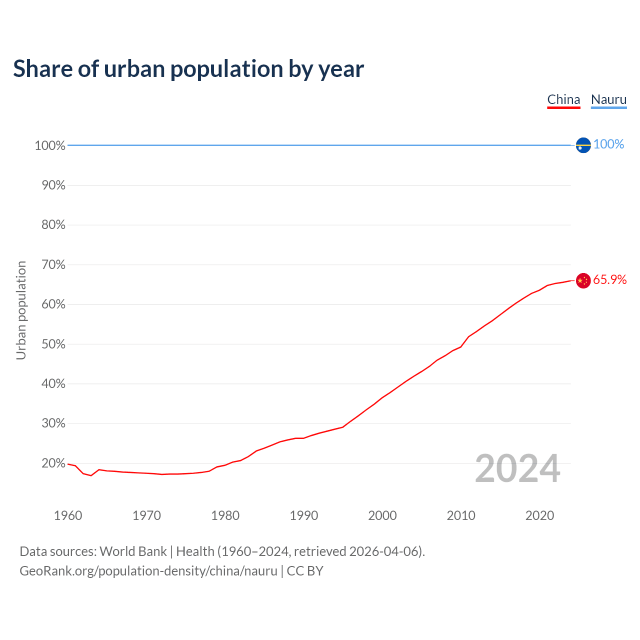 From 2004 to 2024, the share of urban population changed from 41.8% to 65.9% in China and from 100% to 100% in Nauru.