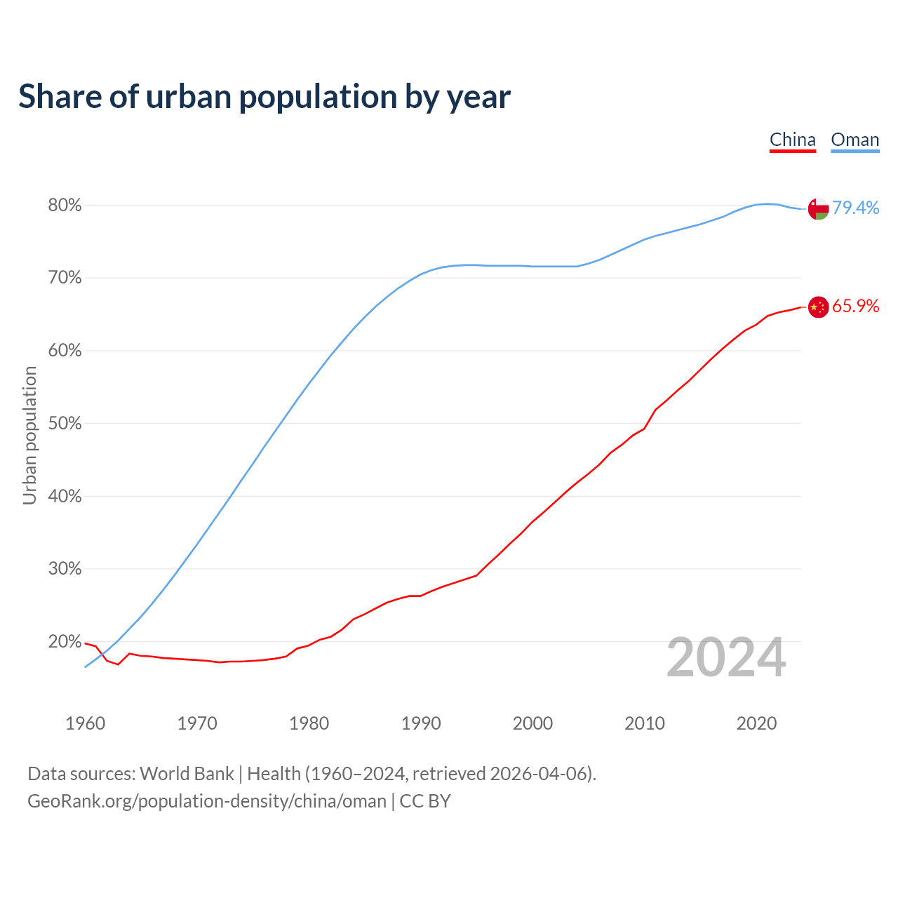 From 2004 to 2024, the share of urban population changed from 41.8% to 65.9% in China and from 71.5% to 79.4% in Oman.