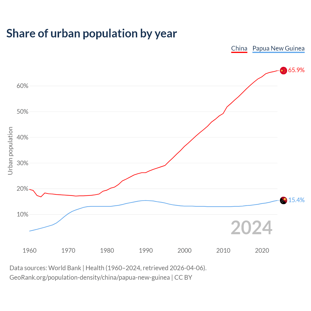 From 2004 to 2024, the share of urban population changed from 41.8% to 65.9% in China and from 13.1% to 15.4% in Papua New Guinea.