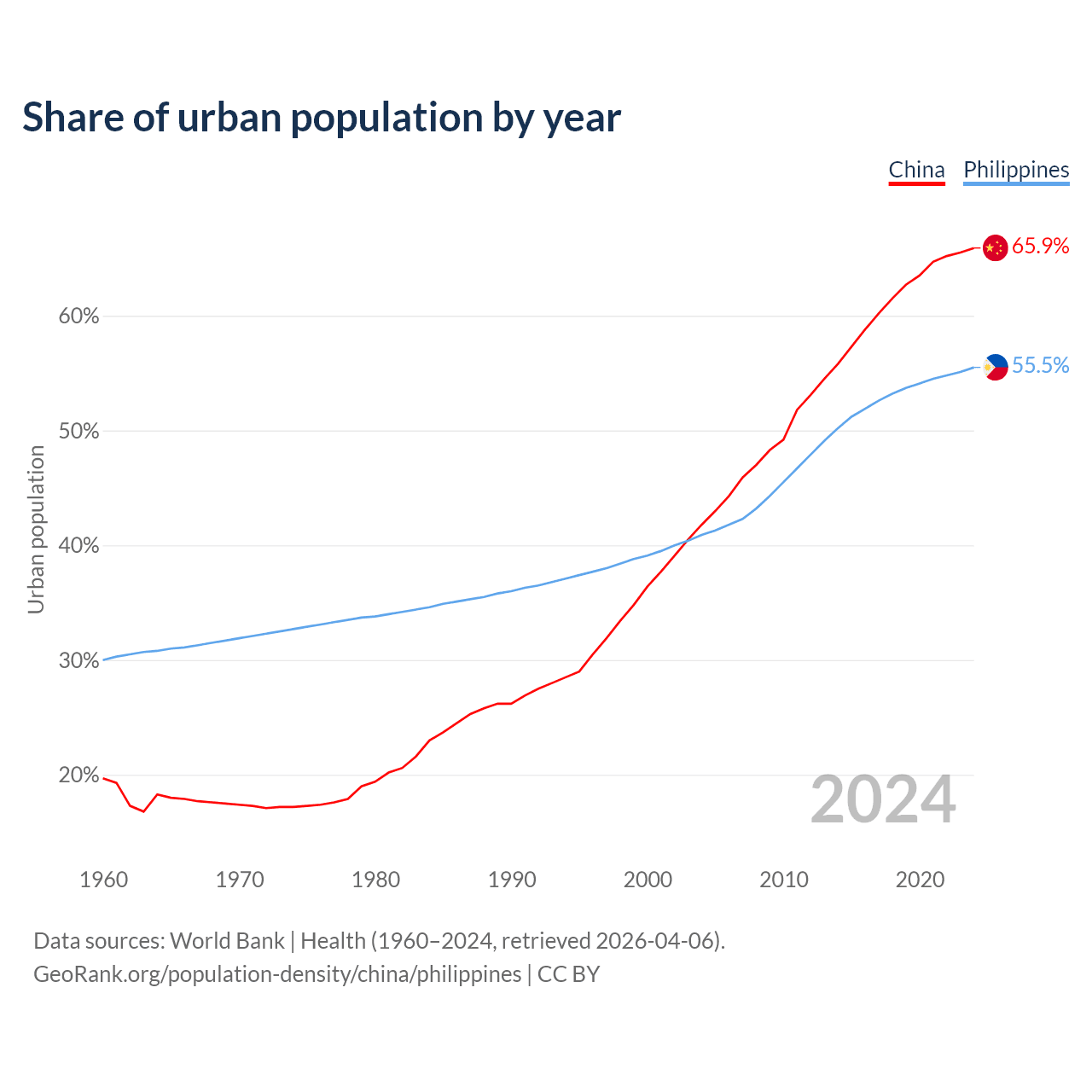 From 2004 to 2024, the share of urban population changed from 41.8% to 65.9% in China and from 40.9% to 55.5% in the Philippines.