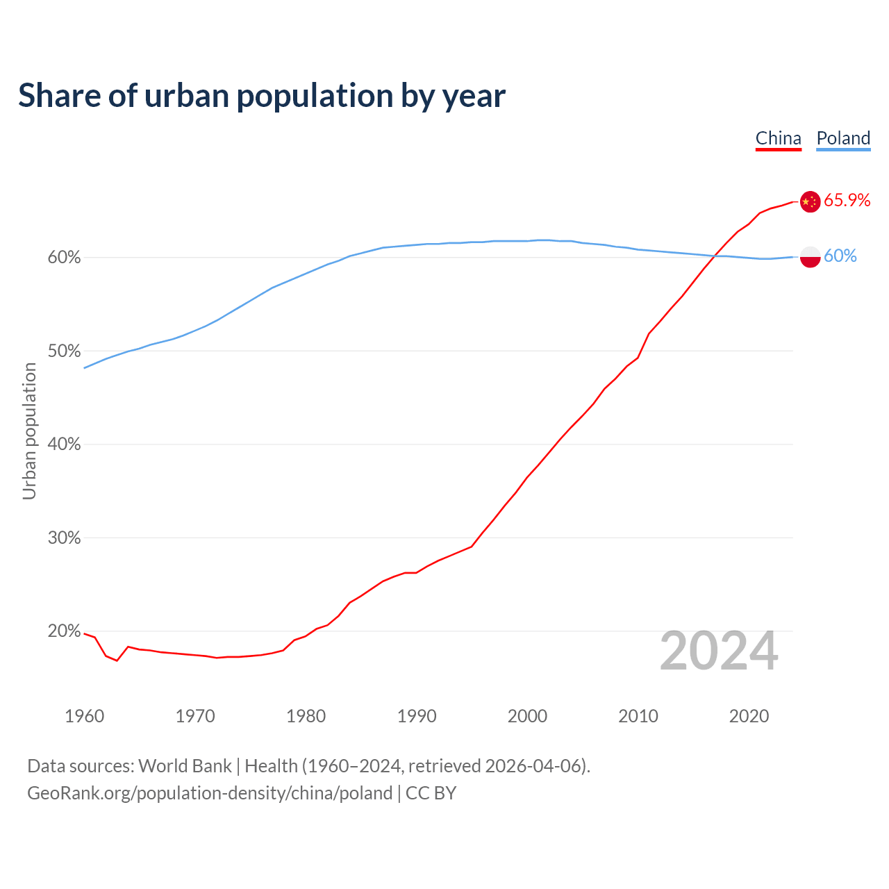 From 2004 to 2024, the share of urban population changed from 41.8% to 65.9% in China and from 61.7% to 60% in Poland.