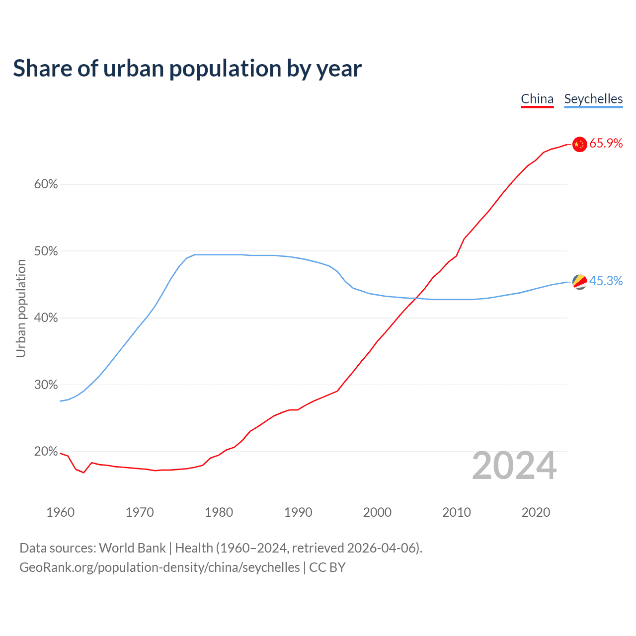 From 2004 to 2024, the share of urban population changed from 41.8% to 65.9% in China and from 42.9% to 45.3% in the Seychelles.