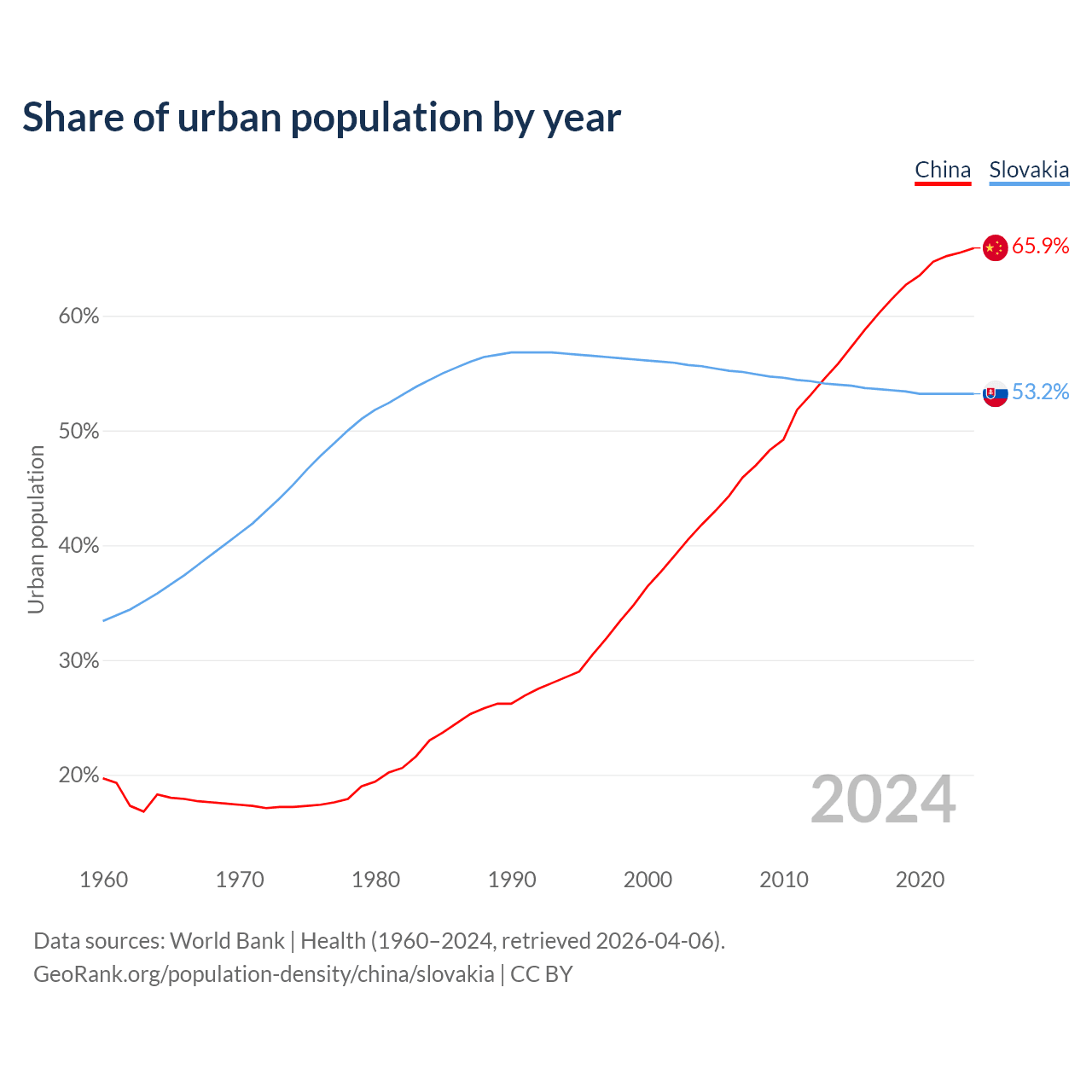 From 2004 to 2024, the share of urban population changed from 41.8% to 65.9% in China and from 55.6% to 53.2% in Slovakia.