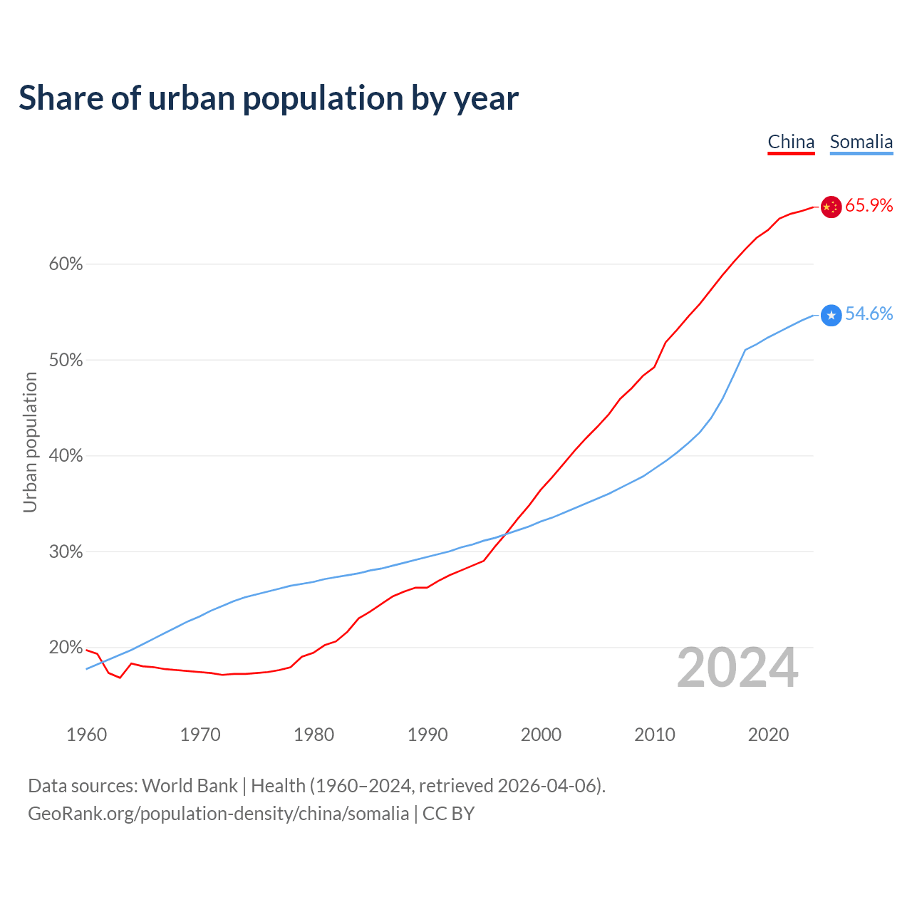 From 2004 to 2024, the share of urban population changed from 41.8% to 65.9% in China and from 35% to 54.6% in Somalia.