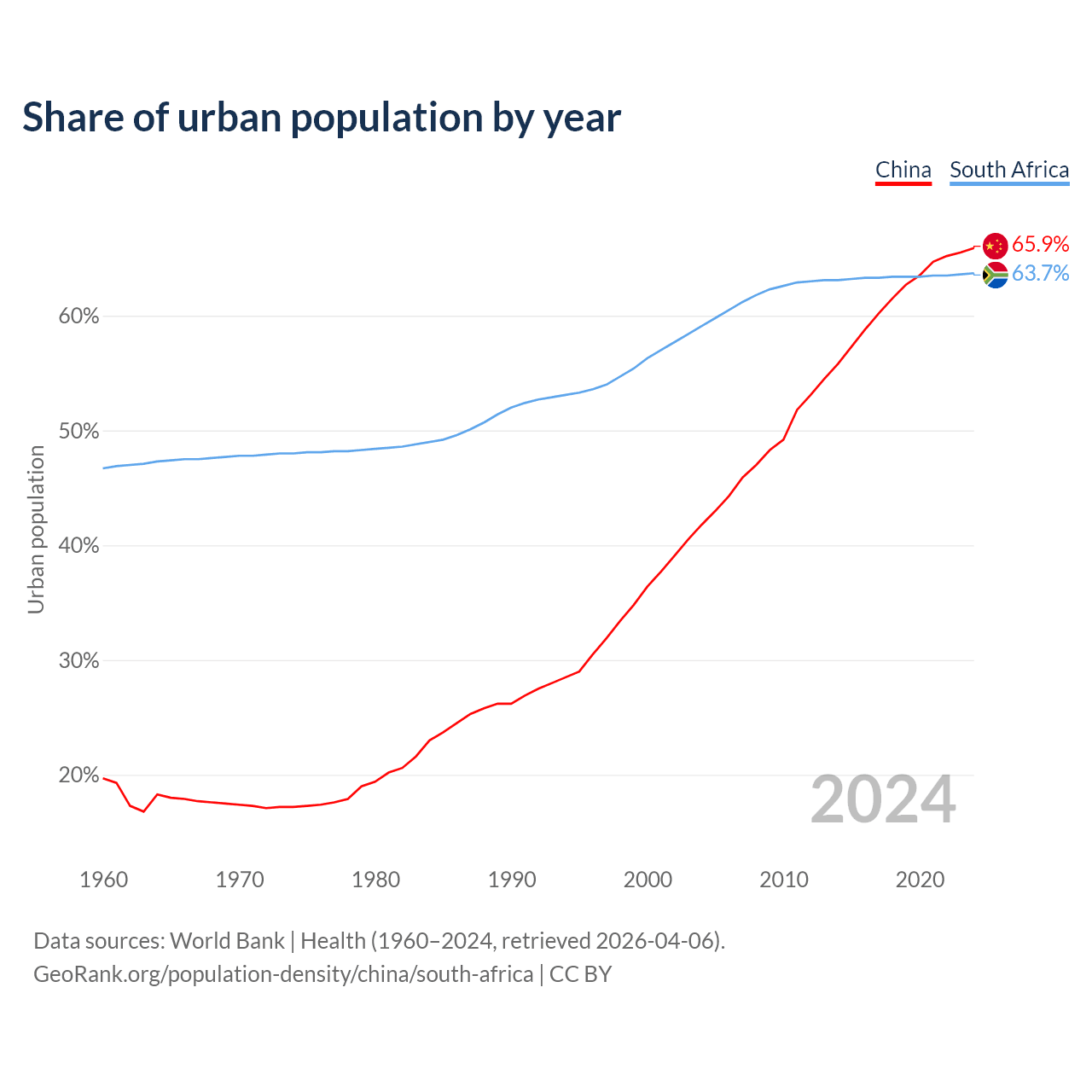 From 2004 to 2024, the share of urban population changed from 41.8% to 65.9% in China and from 59.1% to 63.7% in South Africa.