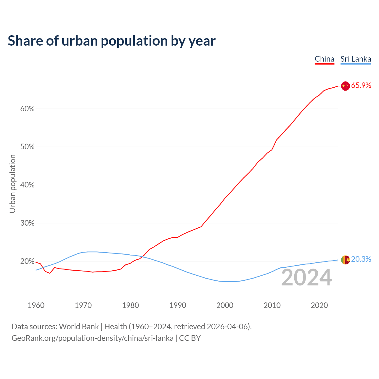 From 2004 to 2024, the share of urban population changed from 41.8% to 65.9% in China and from 14.9% to 20.3% in Sri Lanka.
