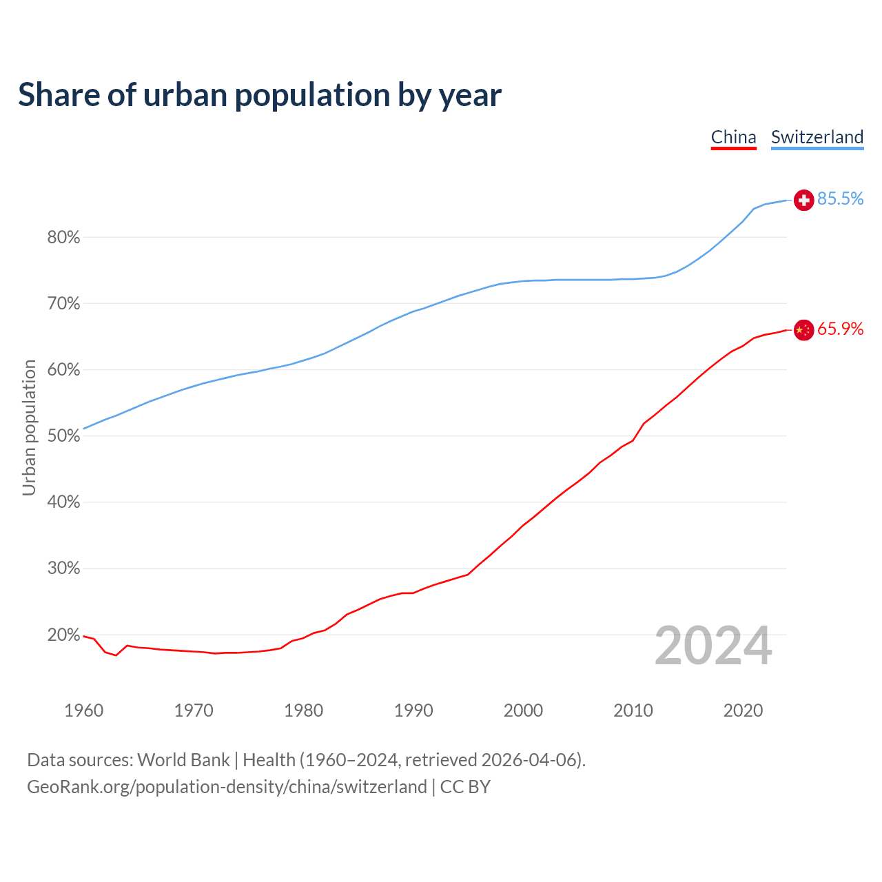 From 2004 to 2024, the share of urban population changed from 41.8% to 65.9% in China and from 73.5% to 85.5% in Switzerland.
