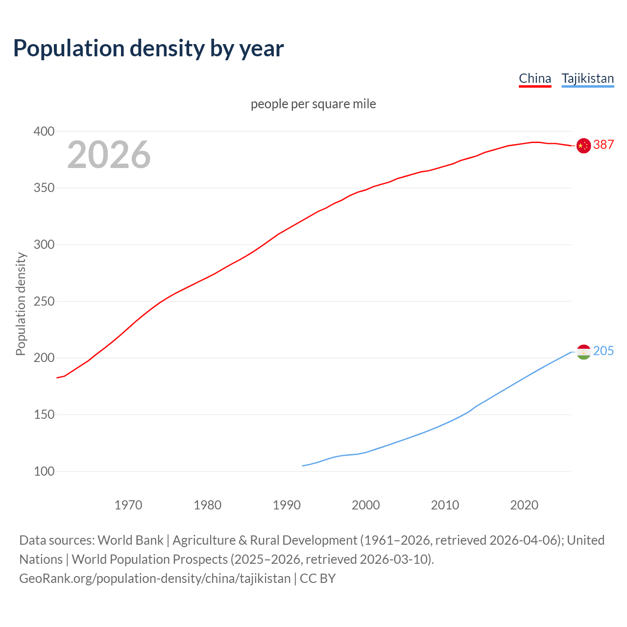 From 2006 to 2026, population density in China increased by 6.98%, compared to a 57% growth in Tajikistan.