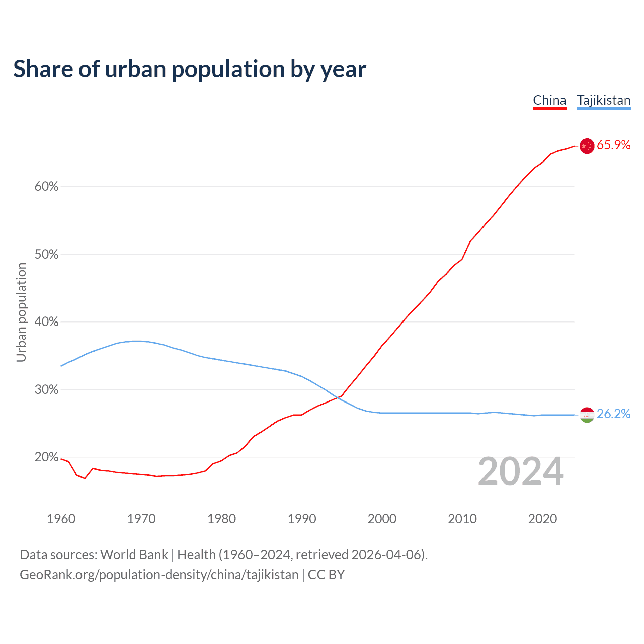 From 2004 to 2024, the share of urban population changed from 41.8% to 65.9% in China and from 26.5% to 26.2% in Tajikistan.