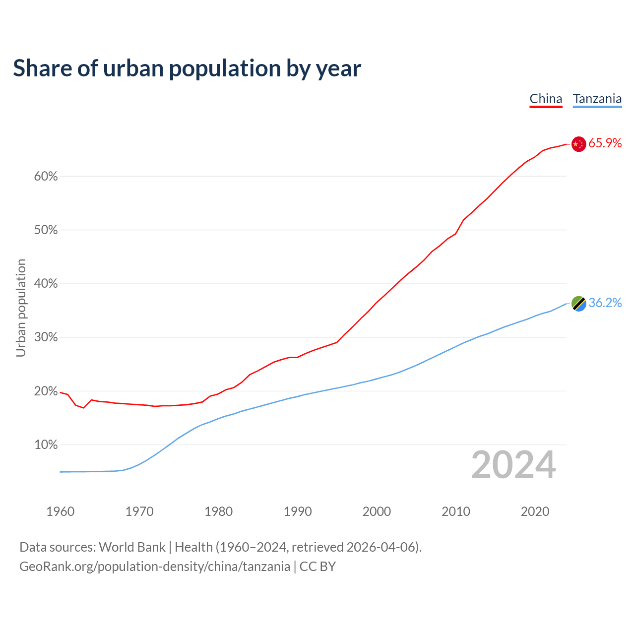 From 2004 to 2024, the share of urban population changed from 41.8% to 65.9% in China and from 24.1% to 36.2% in Tanzania.