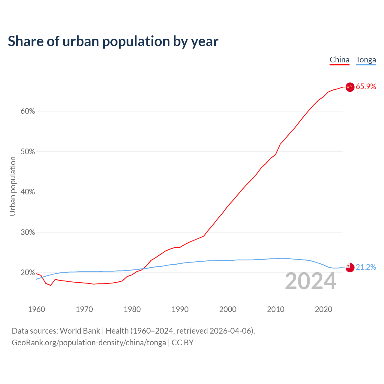 From 2004 to 2024, the share of urban population changed from 41.8% to 65.9% in China and from 23.1% to 21.2% in Tonga.