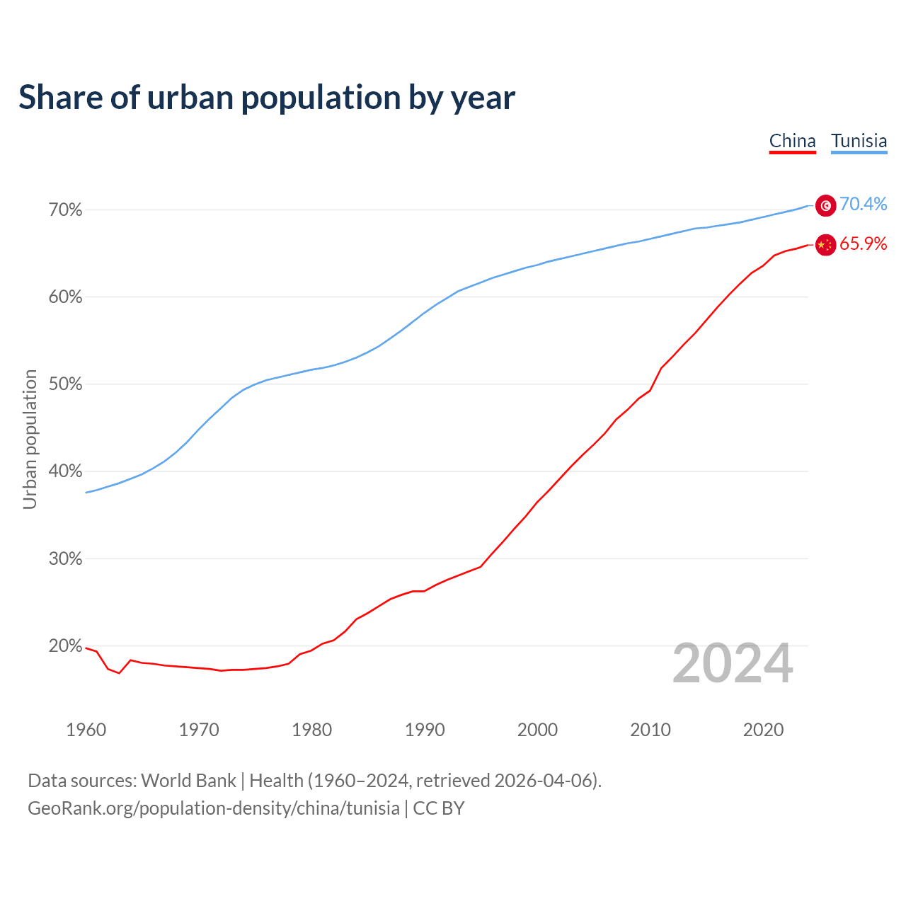 From 2004 to 2024, the share of urban population changed from 41.8% to 65.9% in China and from 64.9% to 70.4% in Tunisia.