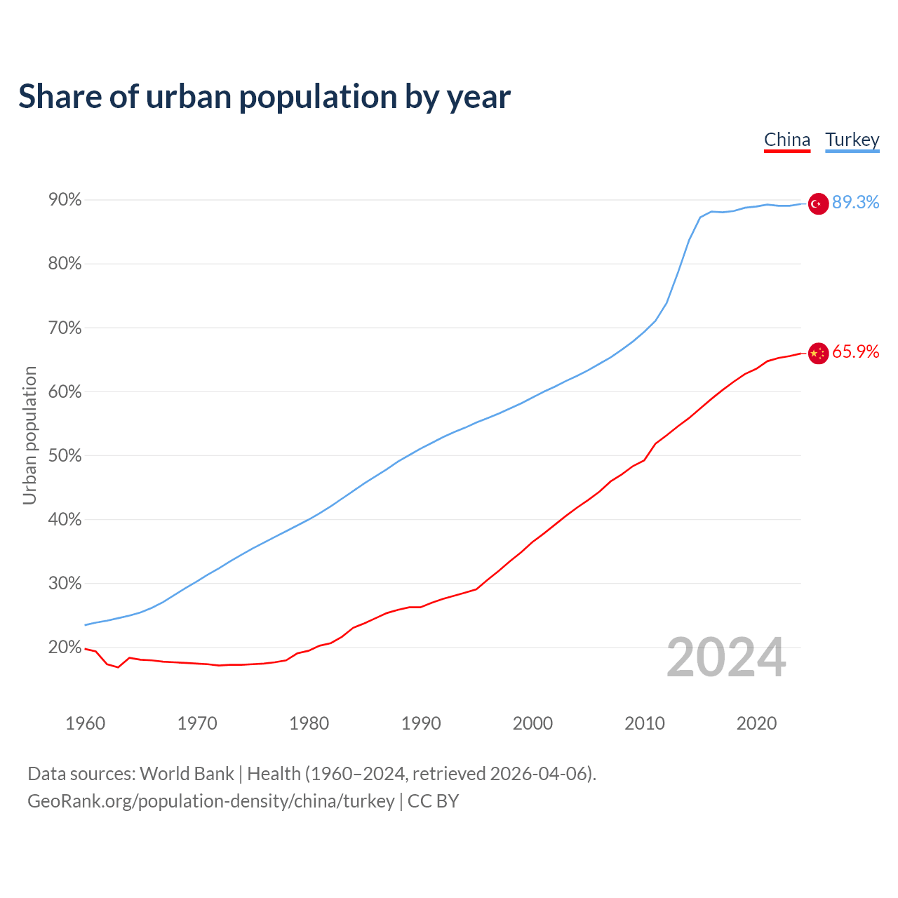 From 2004 to 2024, the share of urban population changed from 41.8% to 65.9% in China and from 62.4% to 89.3% in Turkey.