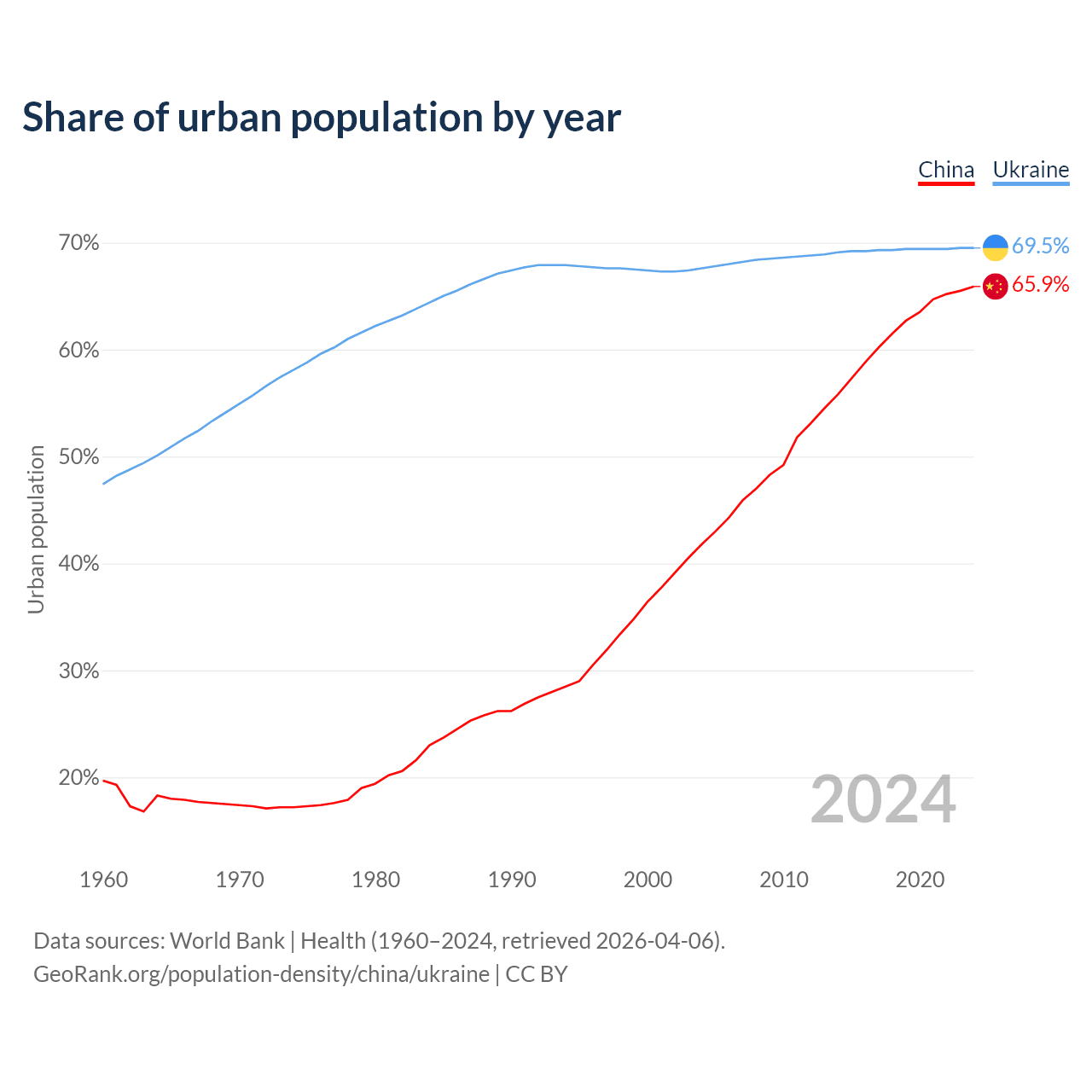 From 2004 to 2024, the share of urban population changed from 41.8% to 65.9% in China and from 67.6% to 69.5% in Ukraine.