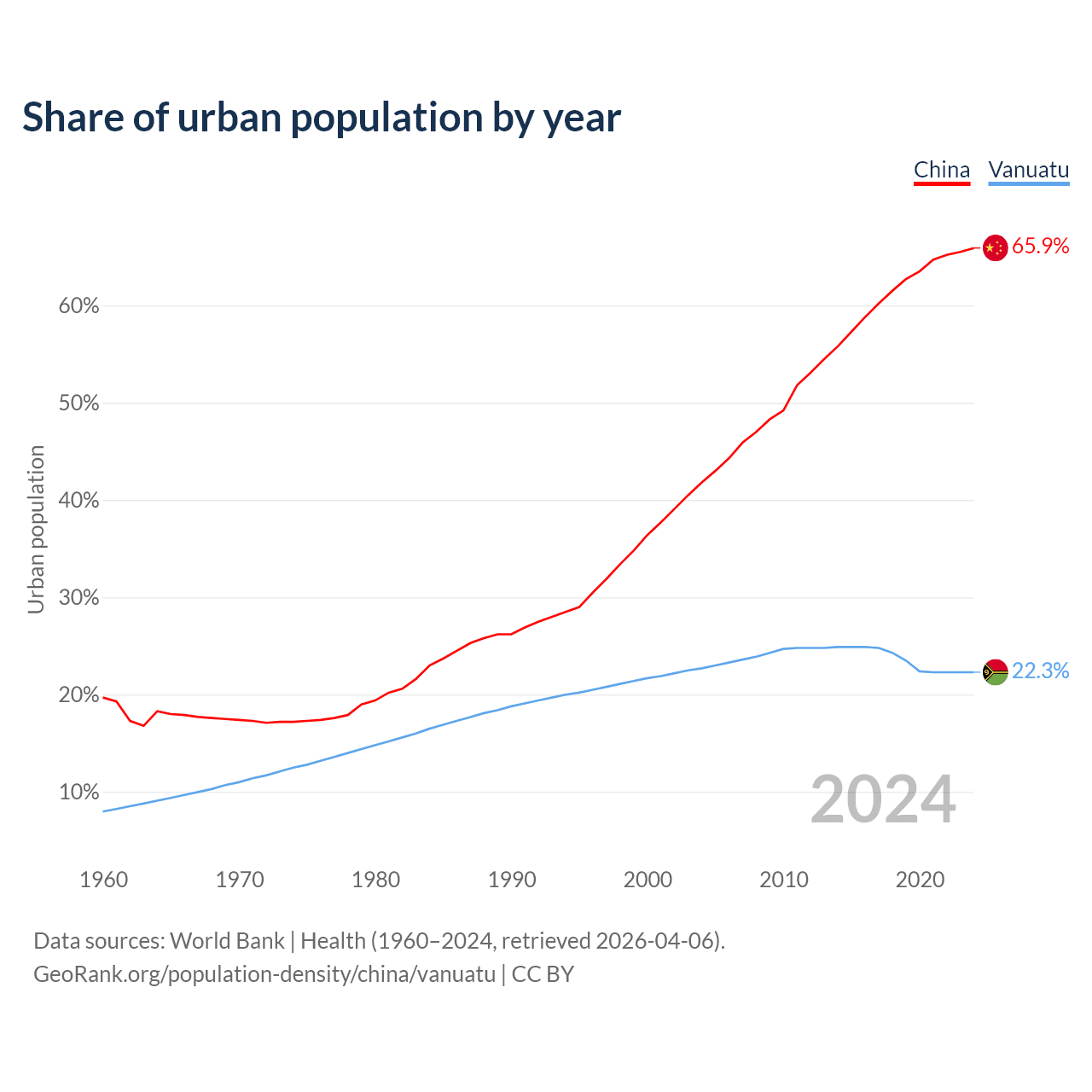 From 2004 to 2024, the share of urban population changed from 41.8% to 65.9% in China and from 22.7% to 22.3% in Vanuatu.