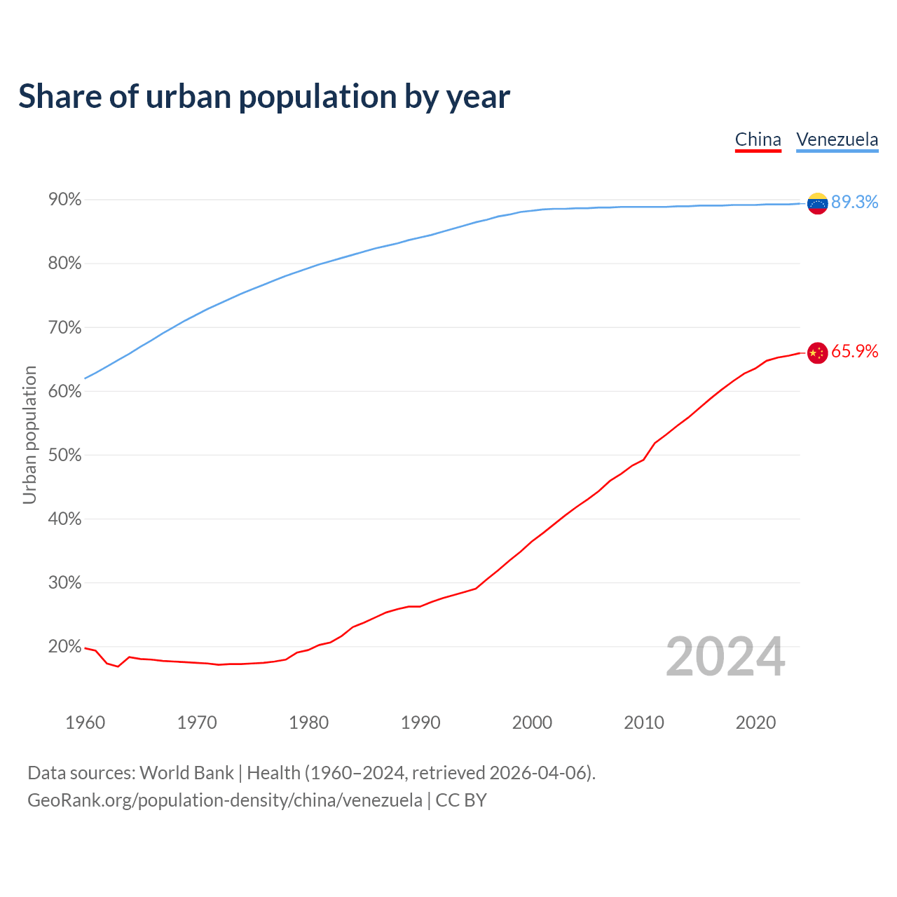 From 2004 to 2024, the share of urban population changed from 41.8% to 65.9% in China and from 88.6% to 89.3% in Venezuela.