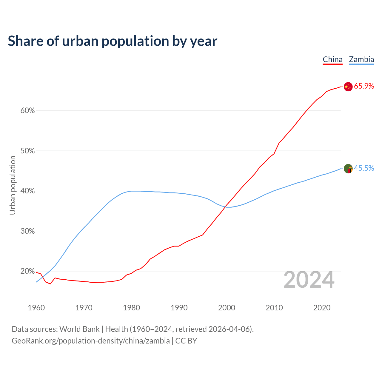 From 2004 to 2024, the share of urban population changed from 41.8% to 65.9% in China and from 36.8% to 45.5% in Zambia.