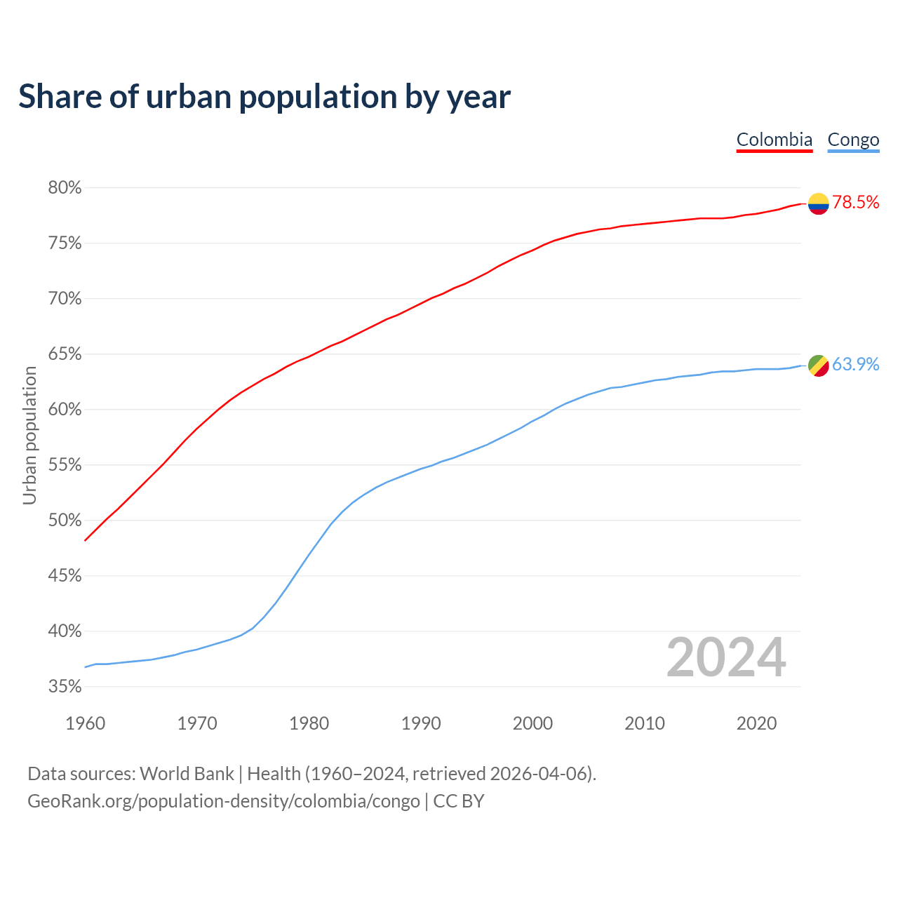 From 2004 to 2024, the share of urban population changed from 75.8% to 78.5% in Colombia and from 60.9% to 63.9% in the Congo.