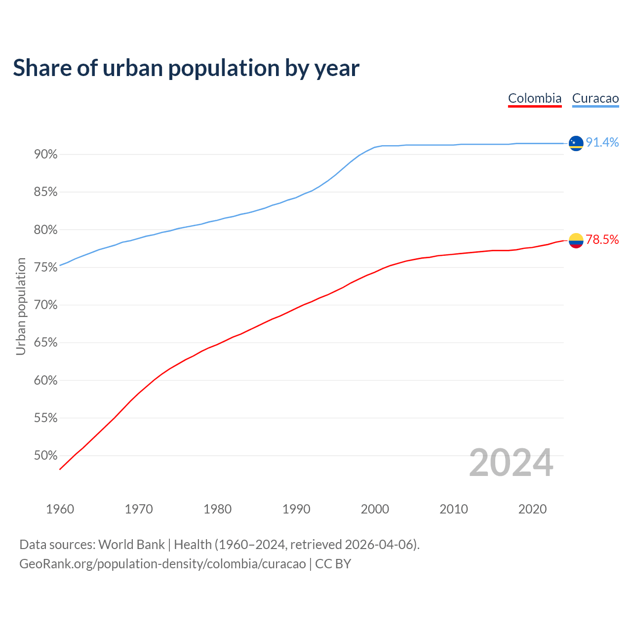 From 2004 to 2024, the share of urban population changed from 75.8% to 78.5% in Colombia and from 91.2% to 91.4% in Curacao.
