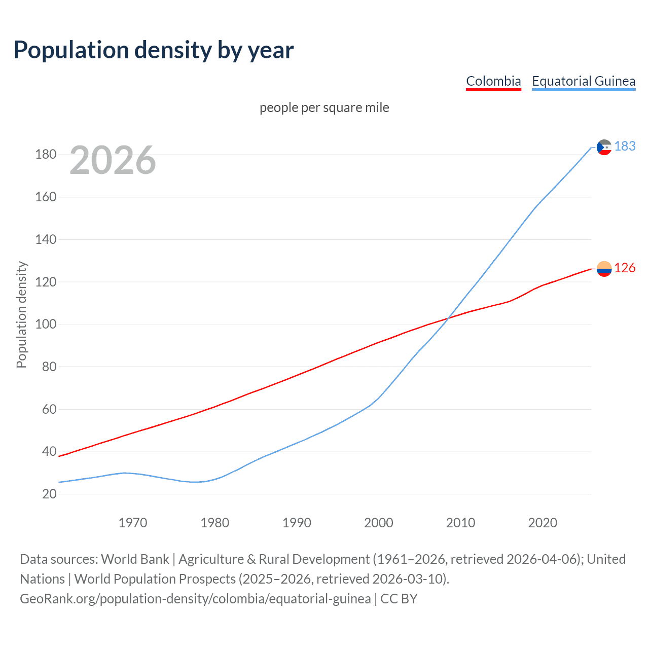 From 2006 to 2026, population density in Colombia increased by 26.4%, compared to a 100.5% growth in Equatorial Guinea.