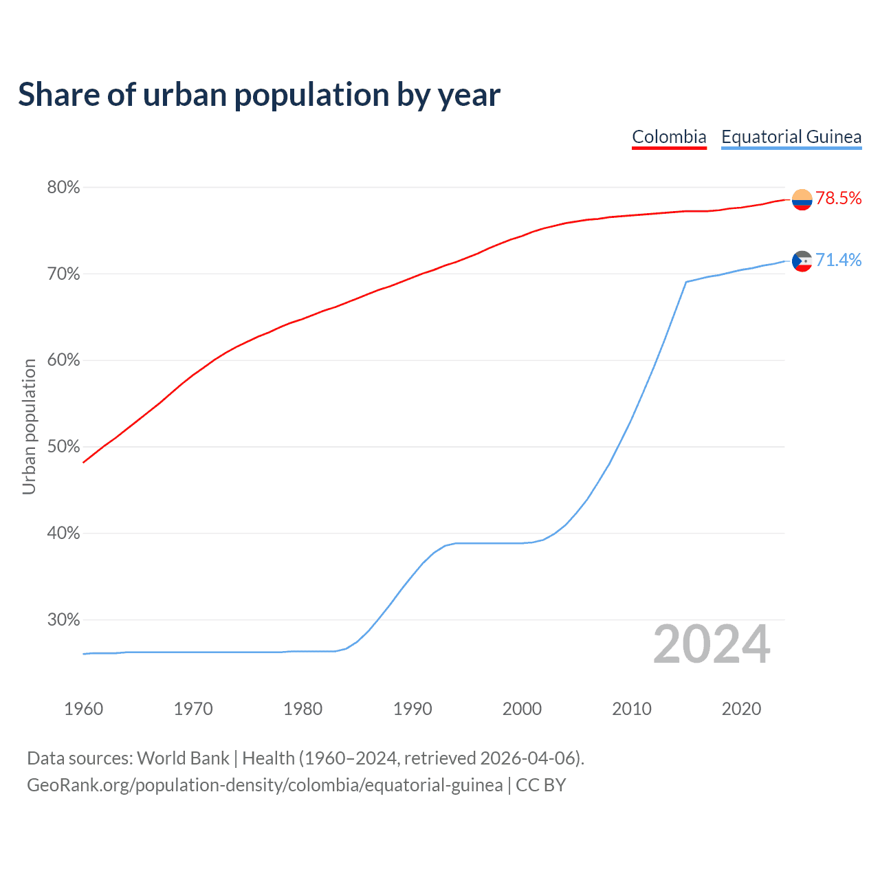 From 2004 to 2024, the share of urban population changed from 75.8% to 78.5% in Colombia and from 40.9% to 71.4% in Equatorial Guinea.